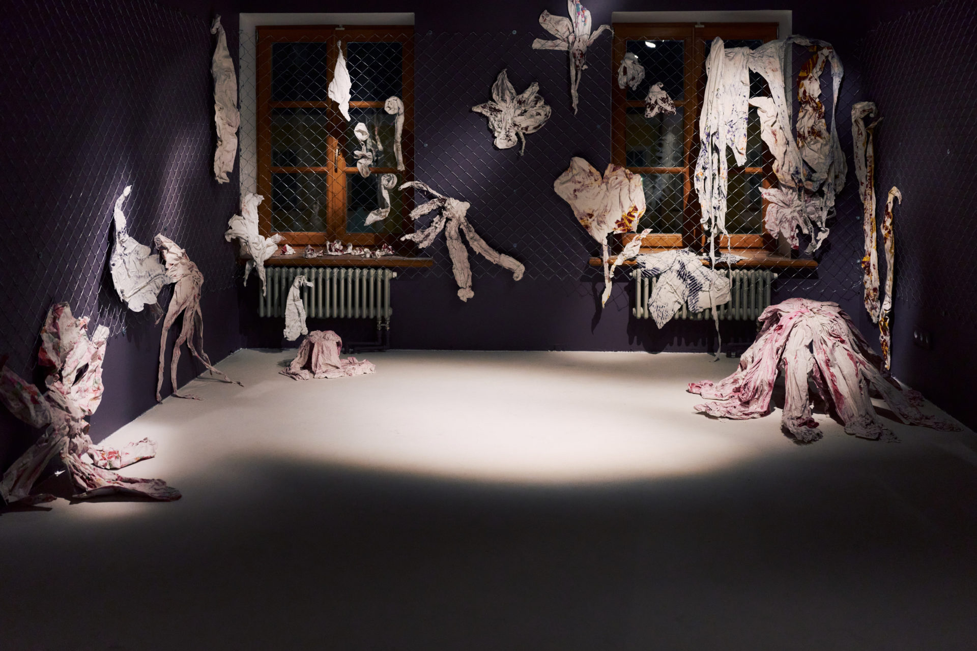 Юлия Смирнова: Прежде всего, это требует от них погружения в материал, и они, как правило, к этому готовы. Такие проекты очень расширяют горизонты работы, потому что авторам важно и интересно не только выразить свою идею и вписаться в экспозицию, но и вступить в диалог с конкретным местом. Может быть, они не всегда об этом думают сразу. Понятно, что у любого художника есть свой почерк, что-то из своих приемов он может повторить, но в таких проектах многое строится на переосмыслении материала. Большая часть работ была сделана специально для выставки. Здесь и занавес Алины Глазун, и шатры Иры Кориной, и живопись Алены Кирцовой, и паутины Аси Заславской, и работы арт-дуэтов Сонин — Самородова, Белова — Политов, Сергей и Татьяна Костриковы.